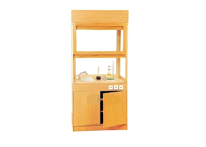 Skriňa spĺňa požiadavky normy GOST 22046-89 „Nábytok pre vzdelávacie inštitúcie. Špecifikácie.“ Skriňa sa skladá z troch častí: spodnej, strednej a hornej a má rozmery 1044x700x2240 mm. V ľavej je namontovaná vodovodná inštalácia na odtok vody a chemických roztokov z umývadla a v pravej sú dve police. Na paneli nad dverami sú nainštalované tri elektrické zásuvky. Stredná časť je rám s orámovanými sklenenými stenami. Spodná vodorovná pracovná plocha sekcie je pokrytá plastom so štruktúrou dreva („buk“). Na ľavej strane je v nej výrez, v ktorom je namontovaný štvorcový keramický drez s rozmermi 250×250 mm s batériou. V hornej vodorovnej stene sú tri vetracie otvory. Je určený na montáž ventilátora a lampy na osvetlenie. Rám strednej časti skrinky je vyrobený z prírodného dreva (buk), ostatné prvky sú vyrobené z bukovej drevotriesky s hrúbkou 16 mm, emisná trieda E1. Konce prvkov z drevotriesky sú ukončené hranou z PVC s hrúbkou 1 mm a 0,50 mm.