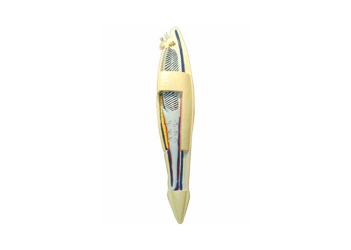 Ukazuje vonkajšiu a vnútornú stavbu kopijníka v pozdĺžnom reze: žiabrová dutina, chord, neurálna trubica, predústny lievik, žiabrové štrbiny, črevo, konečník, chvostová plutva. Vyrobené z plastu a namaľované pestrými farbami.