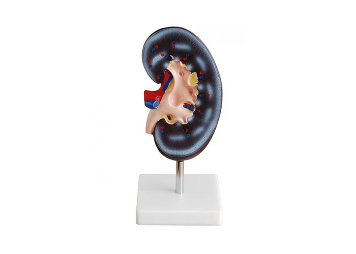 Model znázorňuje anatómiu ľudskej obličky: dreň a obličkovú panvičku, nadobličku, obličkové a nadobličkové cievy a horný močovod. Vyrobený z plastu, namaľovaný v jasných prírodných farbách, na stojane. Veľkosť modelu je minimálne 20 cm.