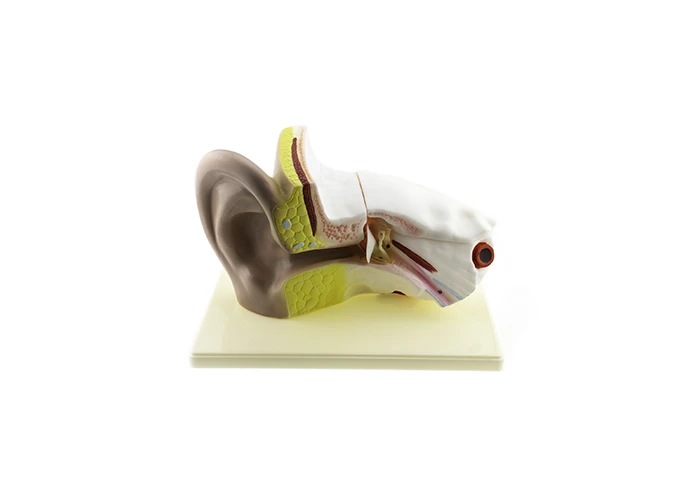 Model je skladací, zobrazuje vonkajšie, stredné a vnútorné ucho s oddelenými sluchovými kôstkami, labyrint so strmeňom, sluchové a vestibulárne nervy. Vyrobený z plastu a namaľovaný v prírodných farbách, mierka nie je menšia ako 1:5