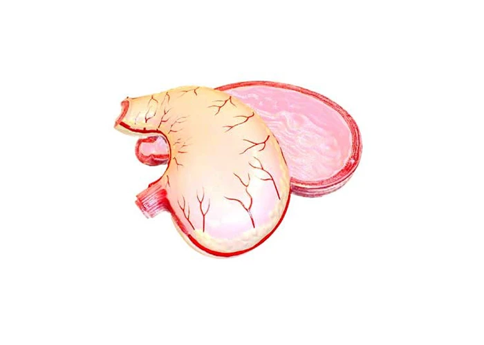 Model je skladací a znázorňuje anatómiu ľudského žalúdka: štruktúru žalúdočných svalov, všetky vrstvy žalúdočnej steny, reliéf slizničných vrások, cievy a spojenie pažeráka a žalúdočného zvierača. Je vyrobený z plastu a namaľovaný v jasných prírodných farbách. Rozmery modelu sú minimálne 25 x 20 x 10 cm
