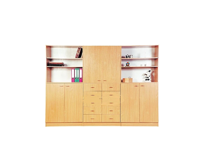 Školská stena v učebni je určená na dokončenie učební vo vzdelávacích inštitúciách a kanceláriách.Konštrukčné prvky sekcií: fasády, horný a dolný kryt, bočné steny a police sú vyrobené z laminovaných drevotrieskových dosiek s hrúbkou 16 mm, emisná trieda E1, na koncoch lepené nárazuvzdornou hranou z PVC s hrúbkou 1,0 mm a 0,5 mm v prípade políc. Farba drevotrieskovej dosky je „svetlý buk“. Na upevnenie sa používa vysokokvalitné kovanie. To všetko zabezpečuje vysokú pevnosť nábytku a zvyšuje jeho životnosť.